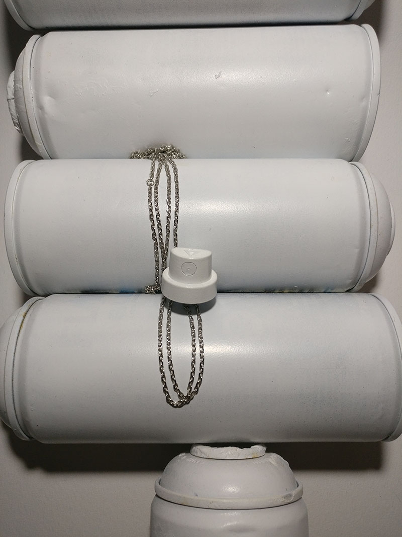 Silver chain with white spray cap.